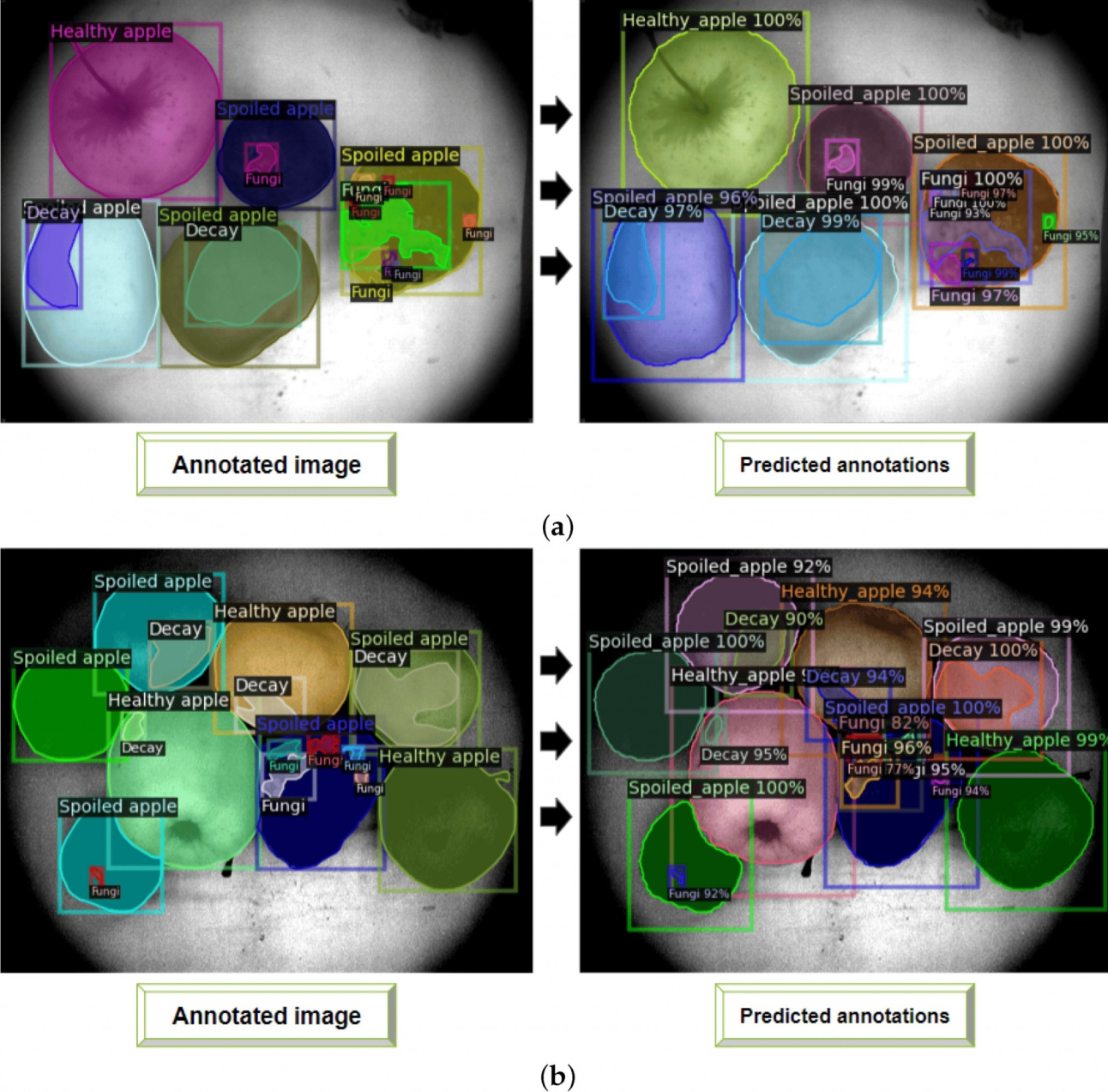 На втором этапе команда занялась обучением сверточной нейронной модели Mask R-CNN. Для нее ученые собрали другой набор данных, состоящий только из инфракрасных снимков. В последствии на них отметили здоровые яблоки и яблоки с участками гниения и плесени.