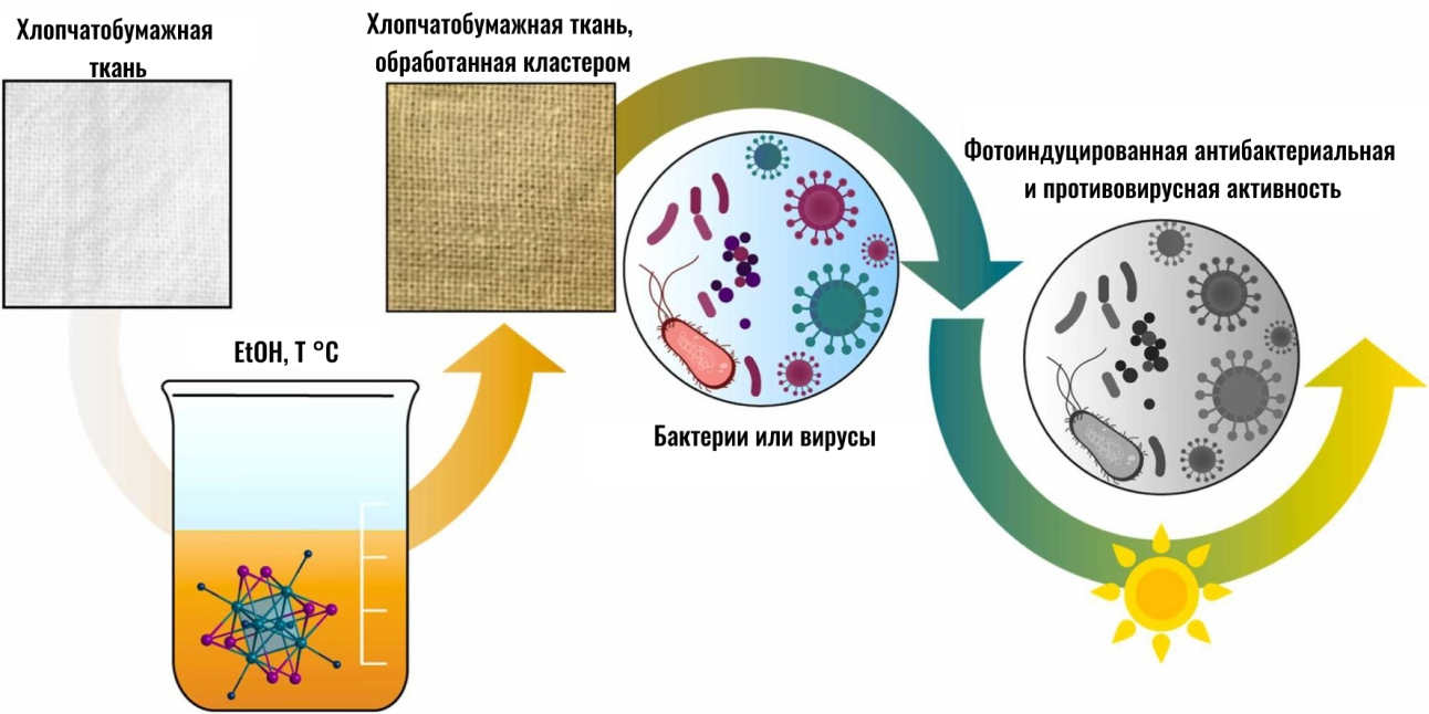 Самостерилизация ткани происходит благодаря фотосенсибилизаторам. Это вещества, которые очень чувствительны к воздействию света, и при контакте с ним они генерируют активные формы кислорода. Обычно у них довольно узкий рабочий диапазон длины волны, и свет, воздействующий на них, должен быть какой-то определенный — к примеру, только красный. Однако исследователям удалось охватить более широкий спектр поглощения света благодаря созданию кластерного комплекса с йодидом молибдена (MoI₆), который представляет собой раствор. Теперь фотосенсибилизаторы смогут поглощать свет от ультрафиолетового до зеленого.